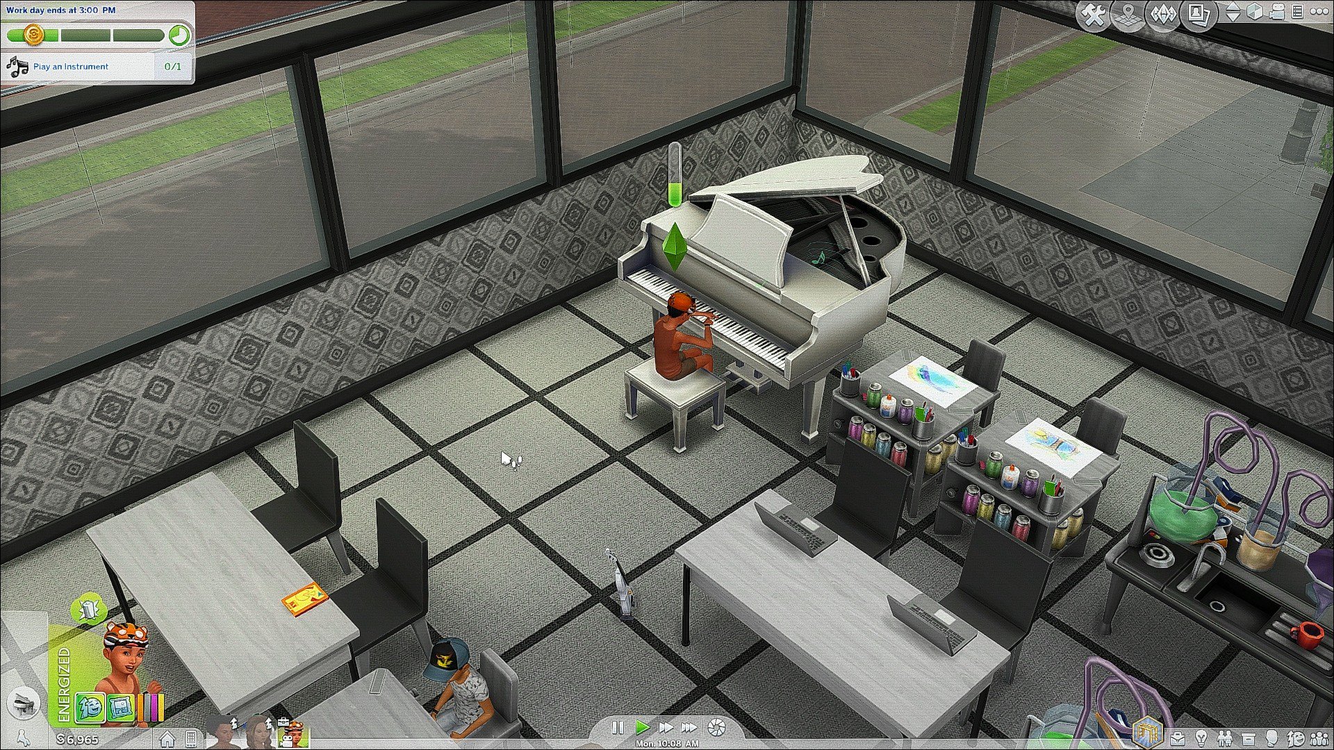 - sims akan masuk kelas dengan guru NPC (Non Playable Character) yang akan muncul di podium dan mengajarkan pelajaran selama beberapa jam (random, antara 1- 4 jam) dimana sims lain akan duduk dan mendengarkan. ketika sedang mengajar, kamu bisa memberikan pertanyaan ke guru NPC dengan mengklik guru tersebut.